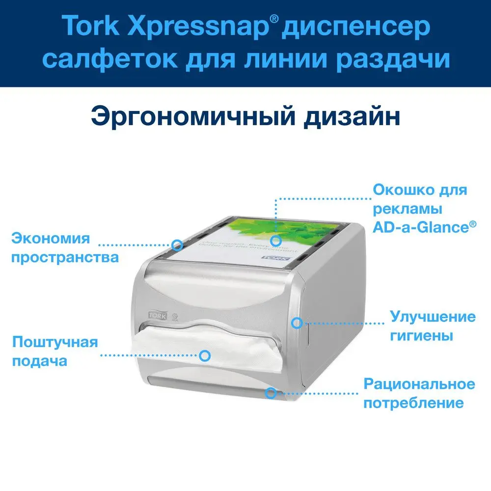 Диспенсер для салфеток Tork Xpressnap для линии раздачи идеально подходит для ресторанов с частичным самообслуживанием, корнеров, барной стойки. В