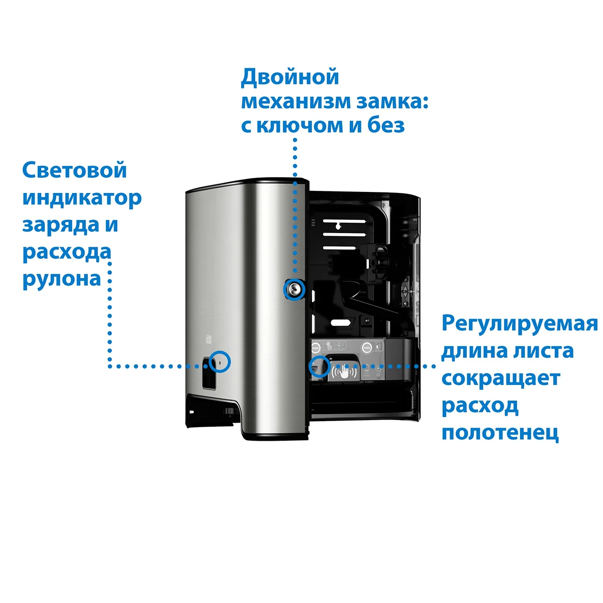 Вид диспенсера – автоматический. Расположение – настенный. Наличие сенсора – да. Наличие замка – да.