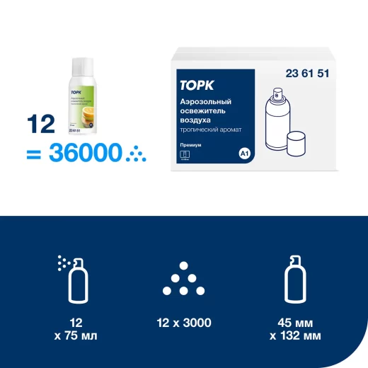 Освежитель воздуха Tork А1 Premium тропический аромат 75 мл содержит концентрированные ароматические масла и запатентованные нейтрализующие вещества, которые устраняют неприятные запахи и гарантирует долгое ощущение чистоты и свежести.