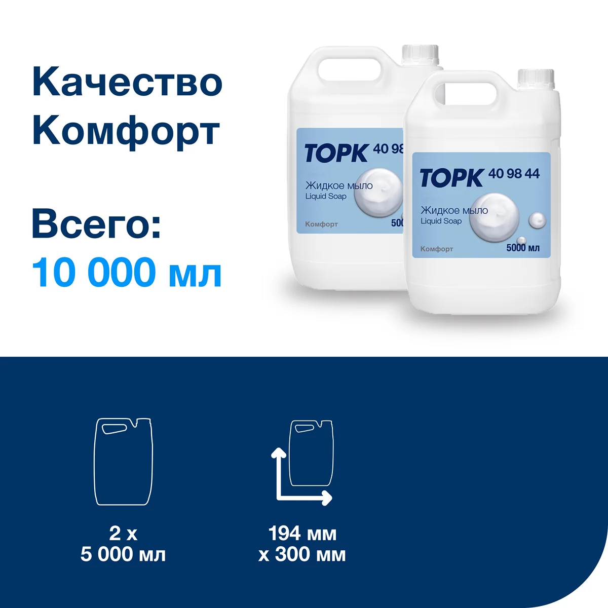 Торк жидкое мыло в канистре – универсальное решение для наливных систем. Одной канистры будет достаточно на 5000 порций*. Благодаря густой консистенции мыло аккуратно дозируется на ладонь и не растекается. В рецептуре используются мягкие ПАВ, оказывающие бережное очищающее действие, а увлажняющий ингредиент- глицерин имеет растительное происхождение. В Торк жидком мыле не используется триклозан и парабены, а состав ph нейтрален. *в 5л объема с учетом порции в 1мл. – Обладает легким ароматом и увлажняет кожу – Все поверхностно-активные вещества, используемые в Tork жидкое мыло, способны к полному разложению в водной среде – pH – нейтрально